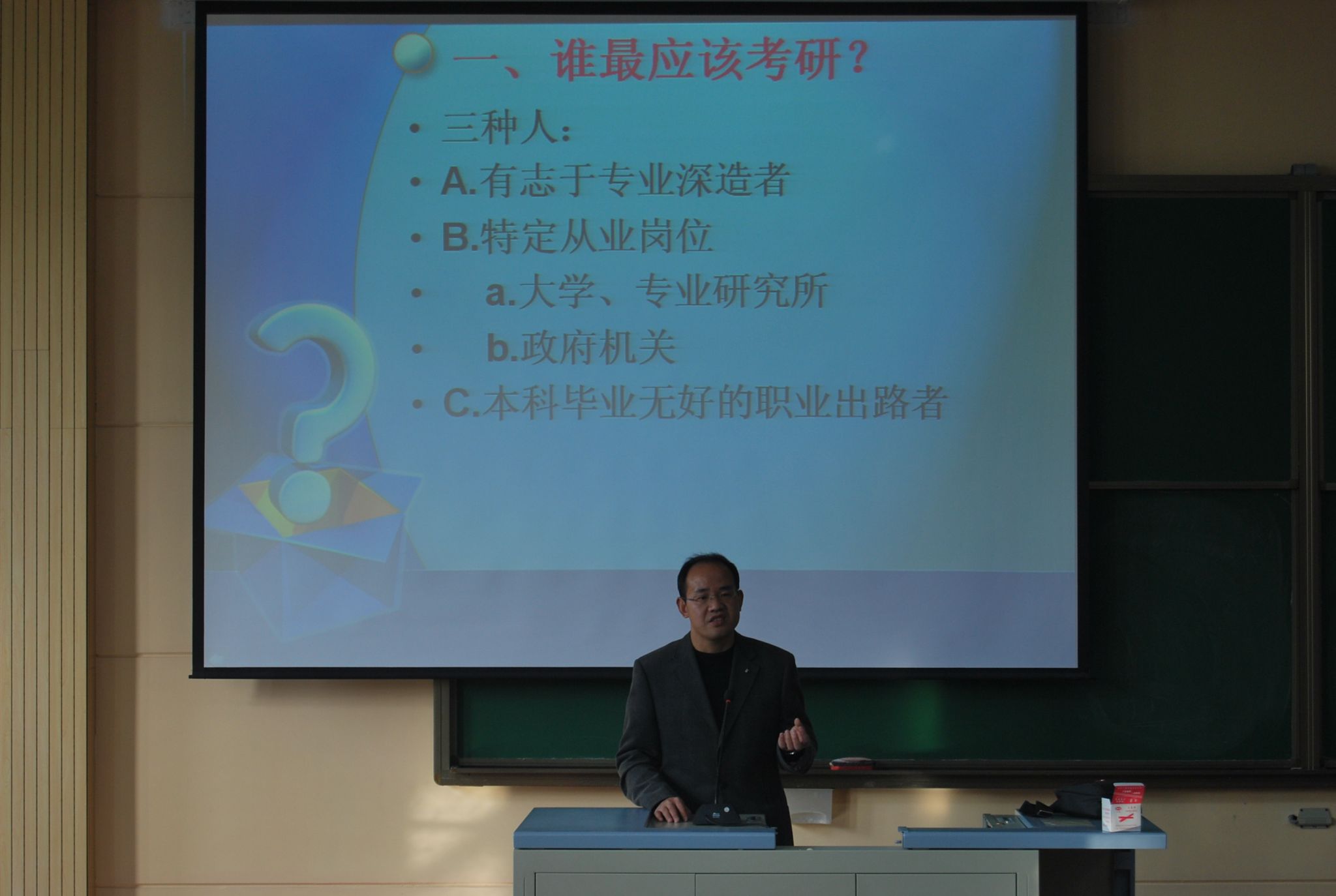 为了使我院学生认清当前考研形势,增强考验信心,科学规划奋斗目标,11月27日下午,我院团总支邀请甘浩博士在公共教学楼A101举办考研专题讲座,辅导员王俊利老师和300余名本科班同学聆听了此次讲座。