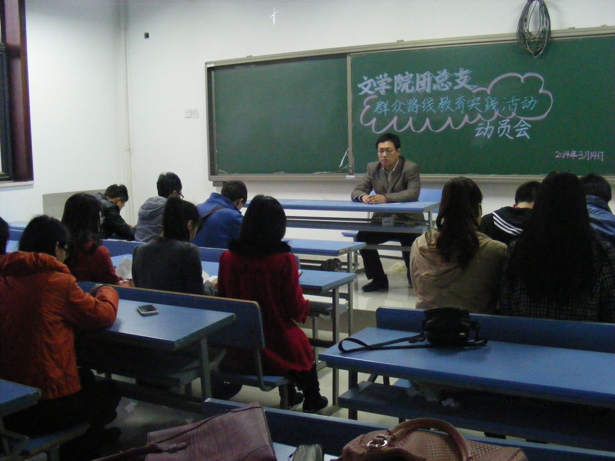 为了响应学校党委号召,我院团总支在全体学生党员、干部中积极开展群众路线教育实践活动。2014年3月14日下午6点,为了对全院的教育实践活动进行部署,我院团总支在文学院楼C116召开党的群众路线教育实践活动的动员大会。参加此次会议的有团总支书记汪鹏和我院学生部分党员、干部。