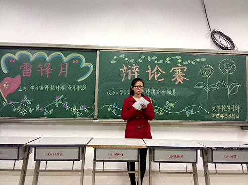 2015年3月19日,应校学生会组织要求,文学院在外语楼C116教室举办雷锋月辩论赛初赛。此次比赛由16名选手参加, 6位文学院学生会干部担任评委。