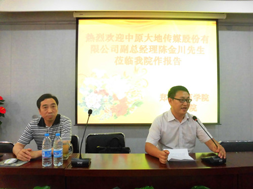 5月26日,中原大地传媒股份有限公司副总经理、郑州大学硕士生导师陈金川先生莅临文学院,在外语楼B411教室为文学院学生讲授题为“从自我认知到社会认知——谈中文专业大学生转型”的专题报告。文学院党务、学生工作负责人汪鹏主持了此次报告。