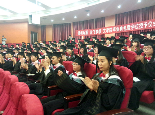 刘钦荣院长在典礼致辞中祝贺2015届全体毕业生顺利完成学业,向毕业生们送上美好的祝愿,对相伴毕业生们成长成才的父母老师表示衷心的感谢并致以诚挚的问候。同时,刘院长也向毕业生们送上毕业寄语,与同学们共勉:一是希望同学们以自信迎接未来,不逃避,不怨恨,直面挫折困难,勇敢迎接挑战;二是希望同学们不失进取之心,胸怀梦想,志在远方,不断丰富完善自我,追梦圆梦;三是希望同学们不忘平常之心,秉持“行为精英,心为平民”的理念,求真务实,不浮不躁;四是希望同学们永怀感恩之心,感恩父母,感恩老师,感恩身边的人和事,平静心灵,开阔心胸,提升境界。最后刘院长说道,母校是同学们永远的家,欢迎同学们常回家看看!副校长张健航、中文系主任白玉红也为毕业生们致毕业词。