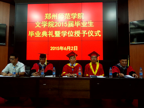 文学院分别于2015年6月2日上午9点、2015年6月16日上午九点召开2015届毕业典礼暨学位授予仪式。毕业典礼由文学院团总支书记张航、辅导员老师李静远主持,郑州师范学院副校长张健航,文学院院长刘钦荣,副院长刘安军,党务及学生工作负责人汪鹏,中文系主任白玉红,辅导员袁春玲、张蕴、张瑜文出席典礼,2015届全体毕业生参加典礼。