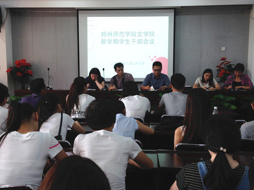 8月29日中午13:00,郑州师范学院文学院在外语楼B411会议室召开新学期第一次学生干部会议。会议由文学院党务、学生工作负责人汪鹏主持,文学院团总支书记张航,辅导员张蕴、张瑜文、李静远,及全体学生干部参加了此次会议。