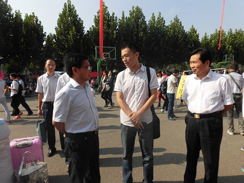 9月3日上午,校党委书记于向英、校长赵健、校党委副书记翟幸福,文学院领导刘钦荣、汪鹏、张航等亲临现场,密切关注院系迎新工作的进展状况。赵校长详细询问了新生报到情况,他强调要从教育学生、培养学生的角度重视和做好迎新工作,让新生和家长满意。于书记询问了新学期学生食宿及课程安排情况,文学院是学校最优秀的院系之一,希望文学院在注入新鲜血液之后更好发展。