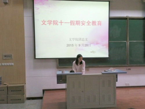 9月29号中午13:00,文学院团总支在综合楼D134教室举办了“国庆安全教育”讲座。讲座由文学院辅导员张瑜文老师主讲,文学院全体2015级新生参加了此次讲座。
