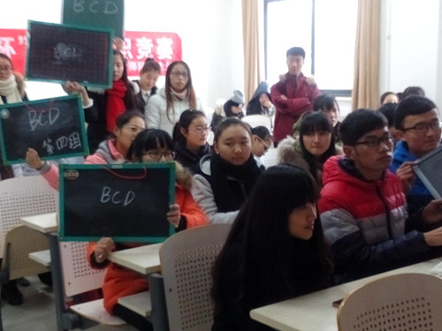 在第一轮的多项选择中,文学院先发制人,选手们踊跃答题,正确率高,最终取得了满分200分的好成绩。紧接着,在限时判断和抢答题中,选手们团结协作,配合默契,与替他学院激烈角逐比分交替上升,赢得场下的掌声阵阵,喝彩声此起彼伏。而后,在风险题中,文学院稍稍落后于其它几组,但依旧保持着沉着冷静的现场发挥,使得文学院最终荣获三等奖。