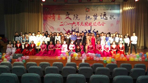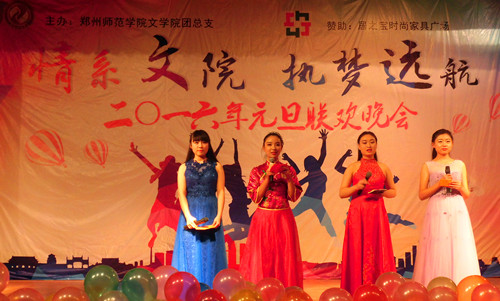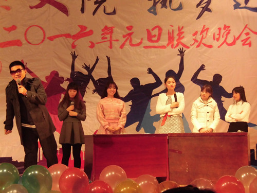 2015年12月17日晚上,文学院“情系文院,执梦远航”2016年元旦联欢晚会在我校西校区7号报告厅内成功举行。校团委社团部部长吴国保、文学院党务学生工作负责人汪鹏、化学化工学院团总支书记李运涛、文学院团总支书记张航、数学与统计学院赵永哲老师及文学院老师徐继英、李爽、张蕴、李静远、邱琳、薛潇出席了本次晚会。