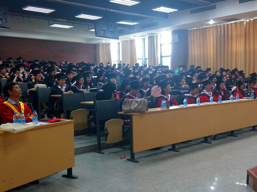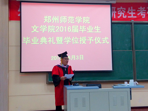 文学院院长刘钦荣向同学们表示诚挚的祝贺,向全体教师表示真诚的感谢。并告诫同学们要做一个“感激、责任、智慧、不断超越”的人。教师代表汤玫英告诉同学们要有建功立业的雄心,战胜挫折的决心,懂得感恩的本心。在校生代表张妍代表全体在校生向2016届毕业生表示祝贺和感谢,并表示定不辜负学长学姐的期盼,努力实现自己的梦想成为社会栋梁。毕业生代表陈璐瑶和李沿分别表达了自己对母校的不舍,并表示自己在郑州师范学院度过了人生中美好的时光。