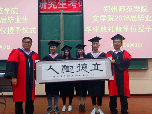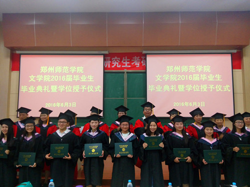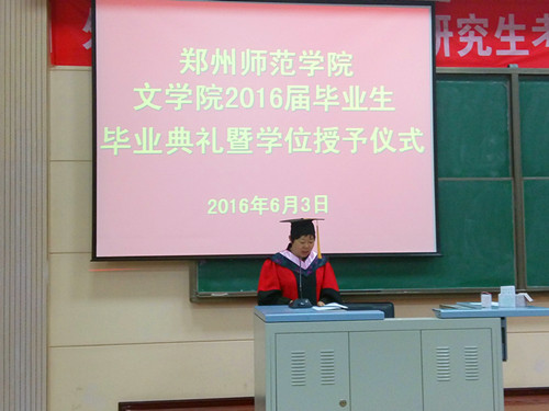 2016年6月3日14时,郑州师范学院文学院于综合教学楼A101教室举行2016届毕业生毕业典礼暨学位授予仪式。郑州师范学院副院长张建航、郑州师范学院文学院院长刘钦荣、文学院副院长刘安军、中文系主任白玉红、对外汉语系主任杜鹃、党务及学生工作负责人汪鹏、团总支书记张航及文学院导师出席仪式。文学院2016届毕业生参加仪式。