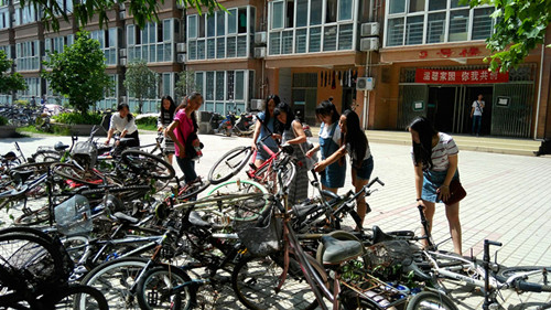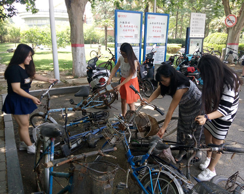 6月6日与7日,文学院将标志着有主的车贴下发给有自行车的同学。8日与9日,文学院同学将车贴贴至爱车上。今日,文学院学生会成员将已收集到的“僵尸车”进行清理。