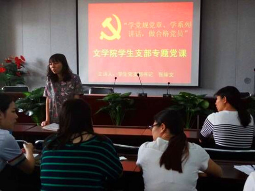 9月5日13点,文学院学生党支部在外语楼B411会议室召开“两学一做”支部专题党课。本次学习活动由支部书记张瑜文老师主持,全体学生党员参加了本次专题党课。