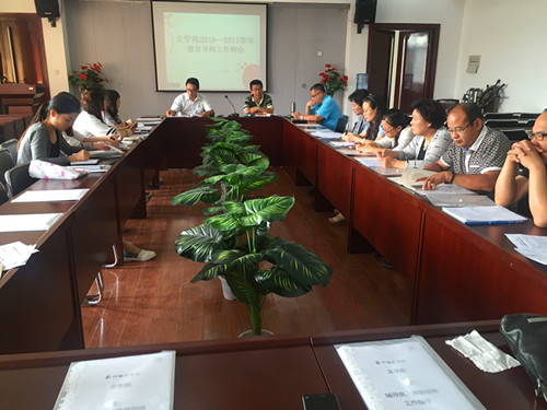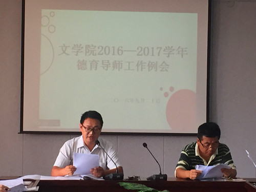 9月20日中午13时,文学院2016-2017学年德育导师工作例会于外国语楼B411会议室举行,文学院院长刘钦荣、副院长刘安军作为德育导师参加本次会议,党务、学生工作负责人汪鹏书记作为德育导师主持本次会议,文学院全体德育导师参加此次会议。