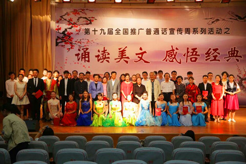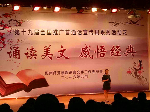 9月28日下午6点半,郑州师范学院于西校区七号报告厅内举办了第十九届全国推广普通话宣传周系列活动暨“诵读美文,感悟经典”诵读决赛。校党委书记于向英、副校长蒋丽珠等领导亲临现场观看比赛并为获奖部门和选手颁奖。河南省朗诵艺术家于同云、肖洒、王琳霞等担任此次评委并倾情演出。文学院选手陈秀婕在本次比赛中赢得第三名的好成绩,荣获二等奖。