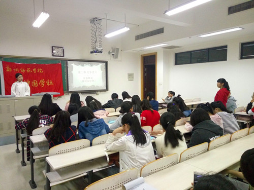 2016年10月20日,寒钟国学社新生辩论赛在东校区综合楼C216教室举行,文学院社联办公室副主任韩菲菲、寒钟国学社社长寇梦鸽、副社长千囯耀、晨读部部长李宁、活动部部长宋玉博以及汉服部部长李亚汝担任评委,张玉同学担任主持。