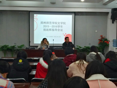 2016年11月22日下午5点,文学院于外语楼B411会议室举行了2016——2017学年挑战杯指导会议。文学院院长刘钦荣、教师牛巧红担任主讲人,文学院学生会副主席周玲妹、素拓部部长刑冉冉主持此次会议。