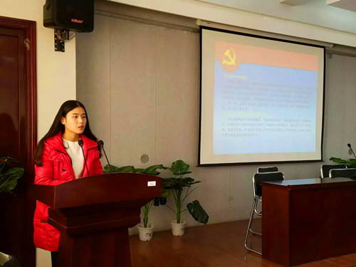 首先,付婷向大家介绍了发展党员工作的指导思想、指导方针及工作原则。并说明发展党员工作要坚持有计划的发展、坚持把质量放在第一位、坚持入党自愿、坚持个别吸收和坚持突出重点的原则。而后,付婷为同学们讲解了成为正式党员需经过的环节,并提出了成为党员的具体要求。最后,付婷说明了当代大学生与正式党员的差距以及成为大学生党员应树立良好的形象。