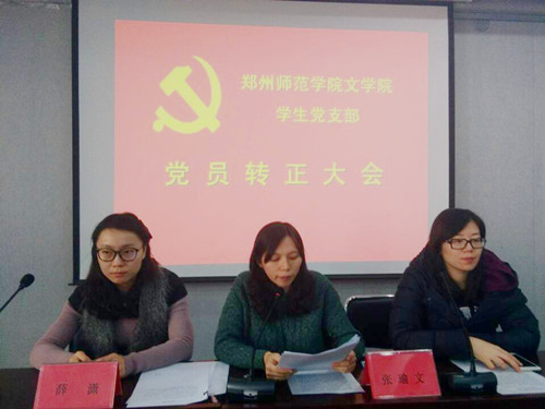 2016年12月22日,文学院于外语楼B411会议室召开了预备党员转正大会。出席此次会议的有文学院学生党支部书记张瑜文、文学院学生党支部组织委员薛潇、辅导员张蕴老师及文学院学生支部全体党员。