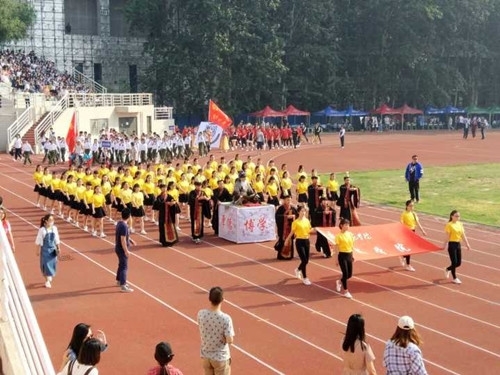 伴着振奋人心的《运动员进行曲》,首先上场的是我校的国旗护卫队,他们铿锵有力的步伐俨然已成为会场上一道亮丽的风景线。随后紧跟的是我校的花束队,她们个个洋溢着笑脸,展现出青春的活力。接着,裁判员方阵和教练方阵进入运动场。然后,迎来的便是各学院的方块队方阵。文学院的同学们迈着整齐划一的步伐,统一着宣传形象的工作装,向主席台前走来。其中,部分领队还身着汉服,与同学所扮的“孔子”一同入场,给在场的观众留下了深刻的印象。