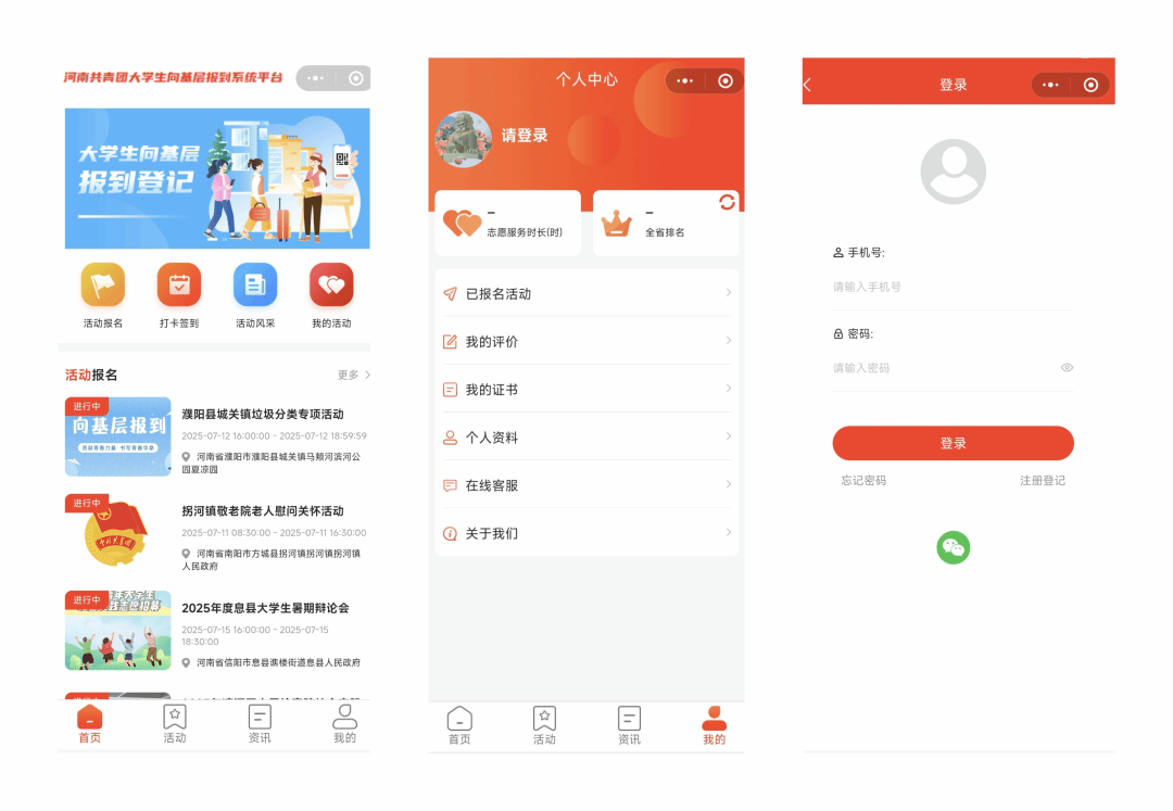 项目简介:依托“河南共青团大学生向基层报到平台”小程序,高校学生在寒暑假期间可以更加便捷地参与家乡各类社会实践活动。各县区团组织通过平台实时发布活动信息,学生可在线报名参与。平台具备活动签到功能,自动记录并累计服务时长;同时,学生参与的每项活动都会被完整记录,假期结束后可自动生成电子证书,登录平台进入“个人中心”—“我的证书”即可查看和下载。