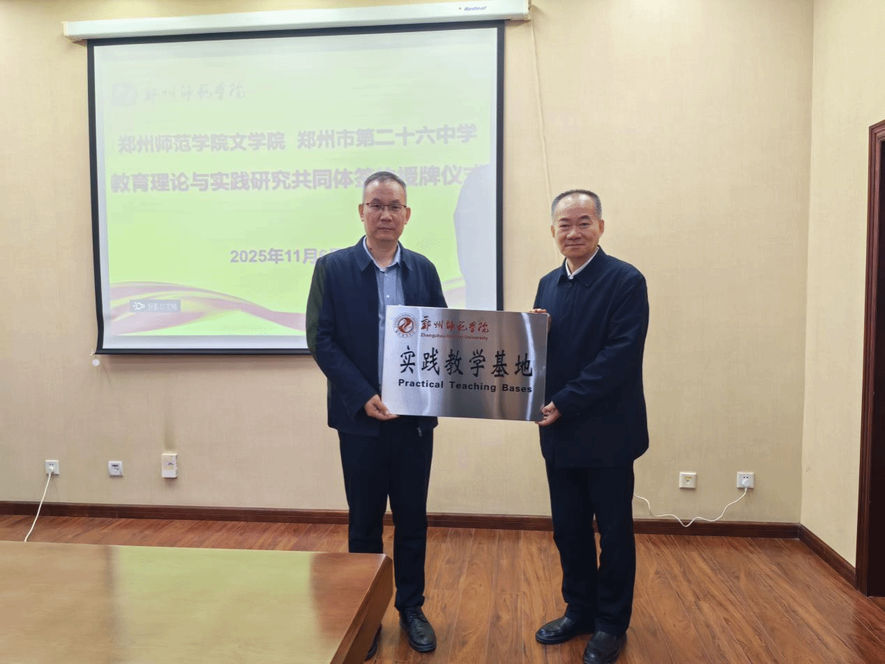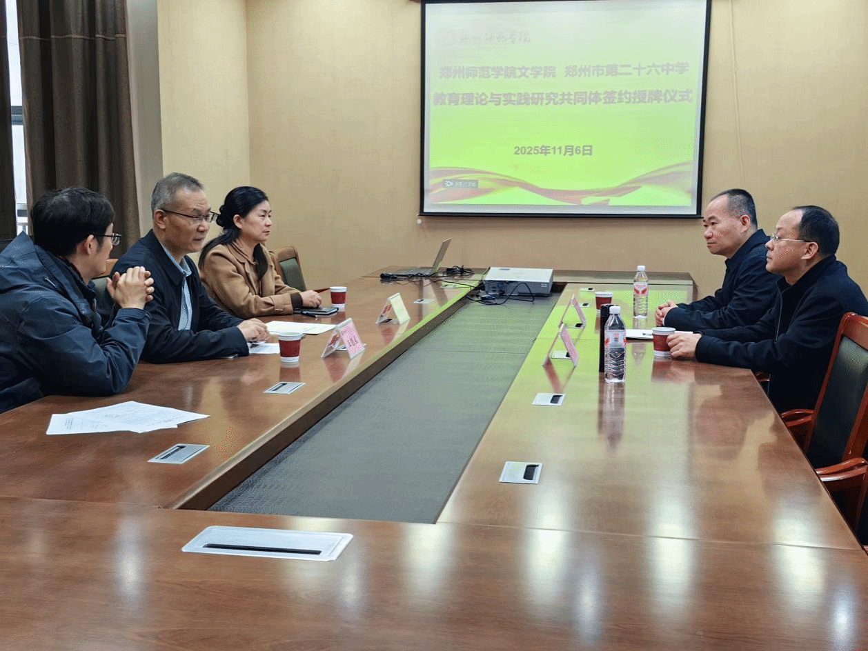 2025年11月6日,郑州市第二十六中学党总支书记程雷、教务主任宋凯一行来到郑州师范学院文学院进行调研,双方就师范生的实习实训、教师的专业发展、教研共同体的建立等问题展开了热烈的交流。会后,双方进行了实践教学基地和教育理论与实践研究共同体的签约及授牌仪式。文学院党政负责人、郑州市第二十六中学党总支书记程雷、教务主任宋凯等出席仪式。