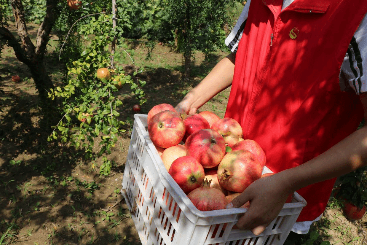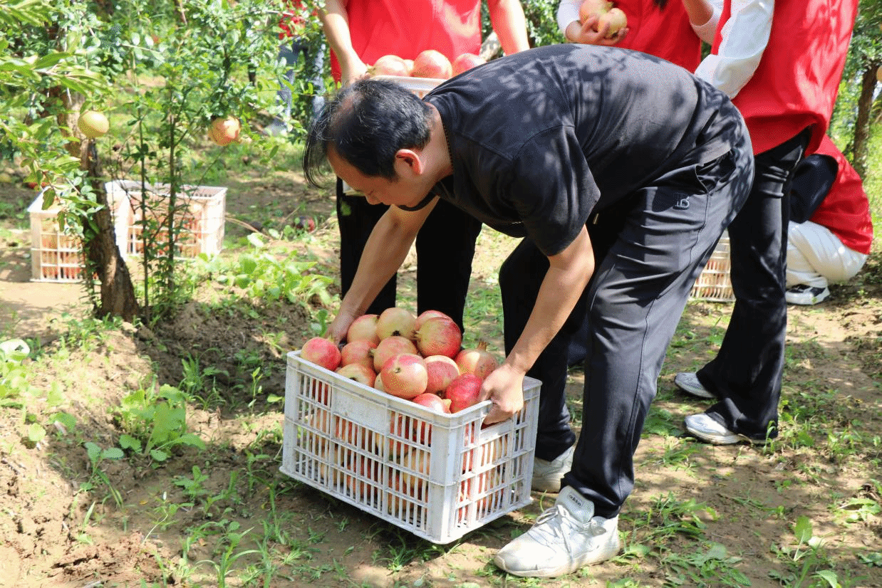 抵达石榴园后,村内工作人员首先邀请师生品尝园内新鲜成熟的石榴,一同感受果实的清甜口感与优良品质;随后又现场指导大家如何辨别成熟度高的石榴、掌握正确的采摘技巧,为后续高效采摘做好准备。指导结束后,文学院的老师与同学们迅速行动,分工参与到石榴采摘、搬运等工作中,以实际行动助力农忙。