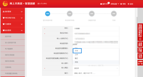退伍复学的团员如何进行转接:需要转入团支部的管理员登录系统,通过“团员管理 —组织关系转接 —办理转入”方式,并提交团员佐证材料,直接发起转接。