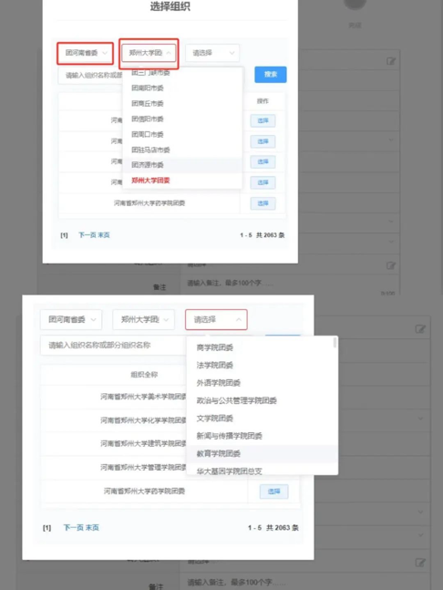 填写信息并提交申请:填写相关信息,带*为必填项:转入组织是否属于北京/广东/福建:选择“否”转出原因:“升学”申请转入组织:第一栏选择“团河南省委”,第二栏选择“xxx学校团委”,第三栏选择“xxx学院团委” ,搜索框中输入所需转入团支部名称,搜索完成后点击“选择”(若班级团支部还未创建,则转入本学院新生待接转团支部)信息填写确认无误后点击“提交”即可。