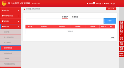 登录:登录转入组织团支部管理员账号,左侧菜单栏中点击“团员管理-组织关系转接”进入“办理转入”页面。