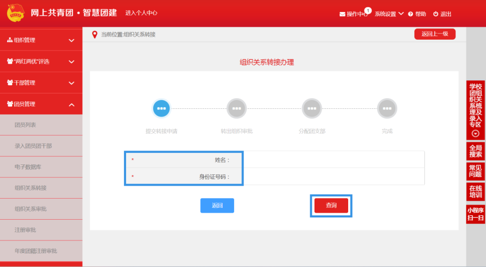 查询:在搜索栏中输入需转入团员的姓名和身份证号,点击“查询”,进入“组织关系转接办理”页面。