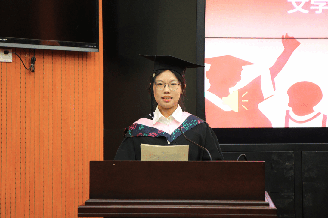 杏坛深耕,桃李竞芳。2025届毕业生申宁歆作为代表发言,向学院全体教师致以崇高敬意与诚挚感谢。她表示,未来将以文学院赋予的学识积淀为基、精神力量为翼,在人生新征程中勇毅前行,让青春在奋斗中绽放光芒。